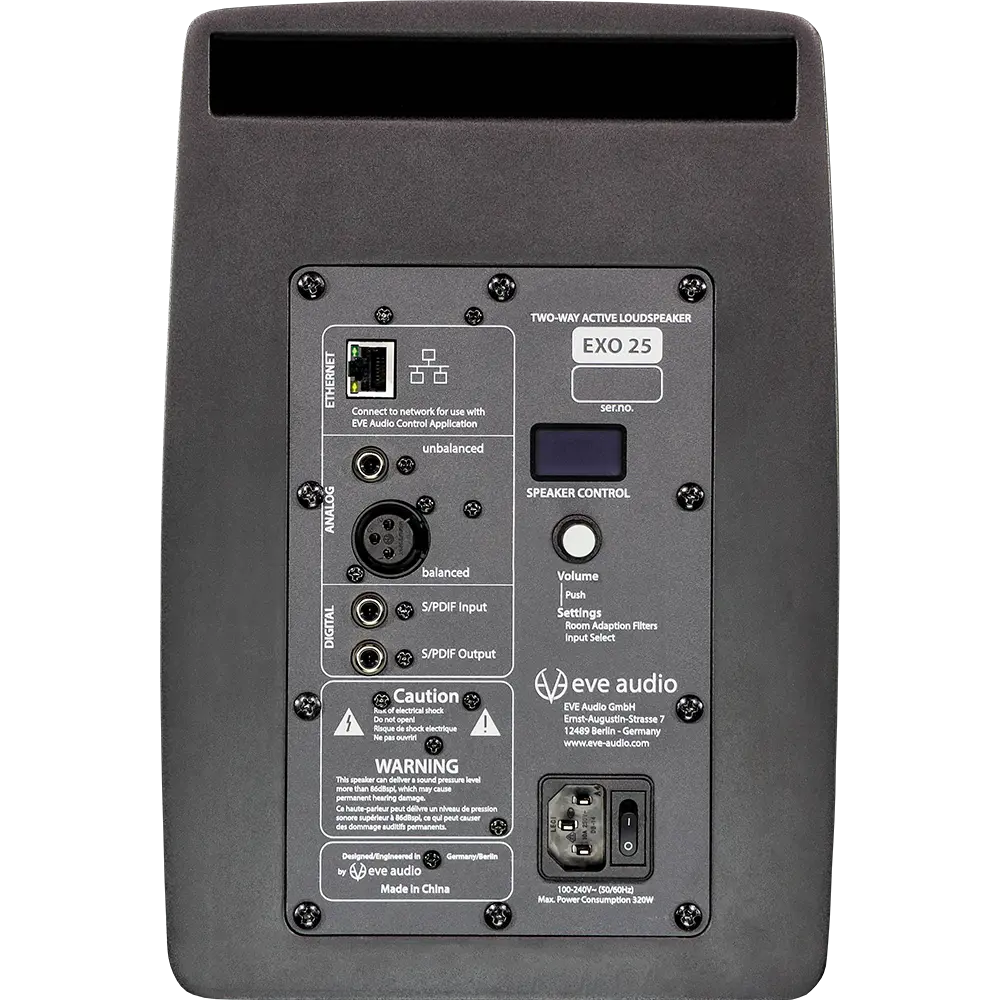 EVE Audio EXO 25 to 2-drożny monitor z 5-calowym głośnikiem niskotonowym, głośnikiem wysokotonowym EXO Precision AirMotion z falowodem GDC, wejściem/wyjściem S/PDIF (192 kHz/24 bity) i łącznością Ethernet do sterowania oprogramowaniem.