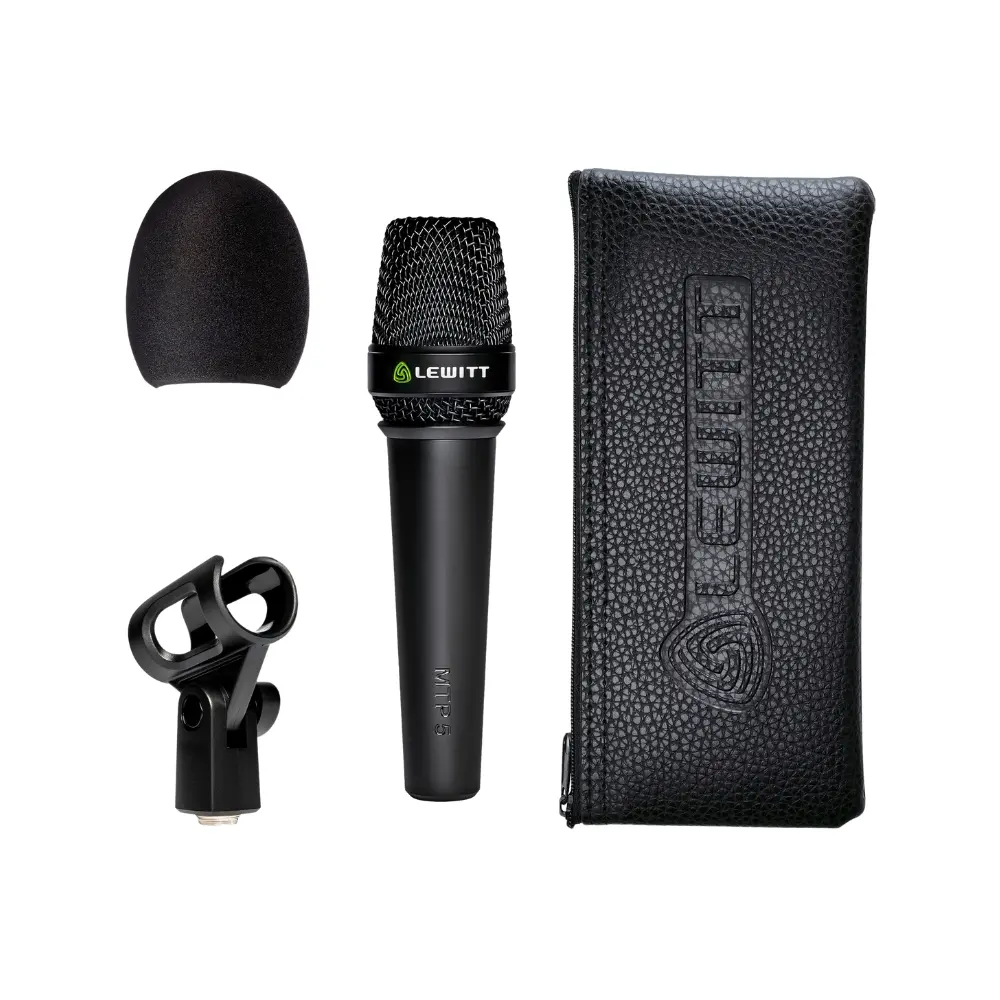 LEWITT MTP 5s jest dostarczany z zatrzaskowym clipem mikrofonowym, osłoną przeciwwietrzną i torbą transportową.